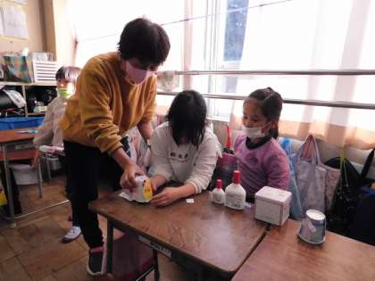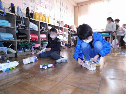 紙コップ、牛乳パックなどを使って動くおもちゃを作っていますね。