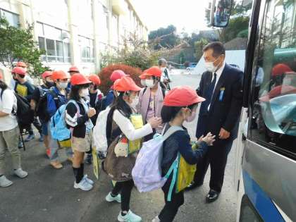 まずは出発前の挨拶です。バス乗車前の消毒も欠かせません。