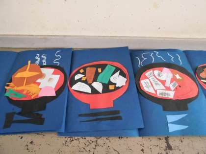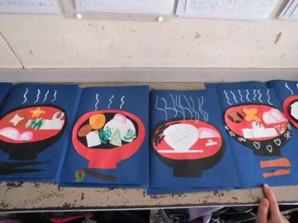 おいしそうなお雑煮が並びました。3学期には2年生の教室前にお雑煮が勢ぞろいします。お楽しみにお待ちください。