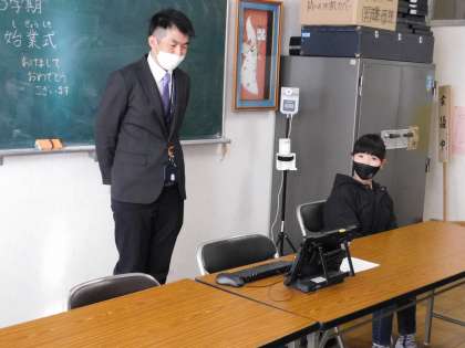 1月10日(火)から3学期が始まりました。副校長先生が司会をしています。校歌も歌いました。