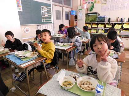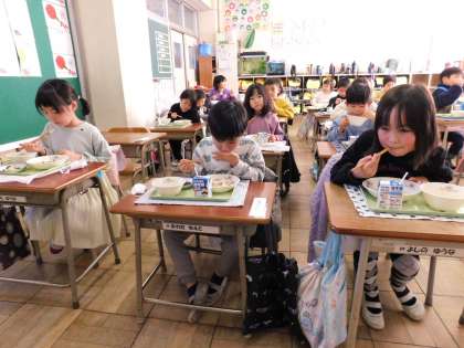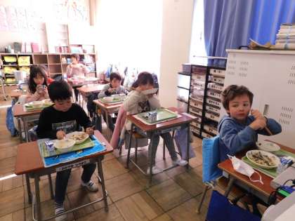 こちらは、1年1組の給食風景です。