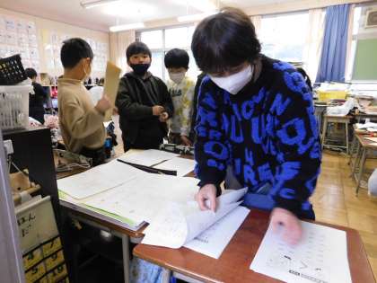 明日14日(火)〜16日(木)まで2年1組が学級閉鎖になります。先生が閉鎖中の学習プリントを準備していました。