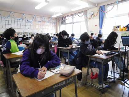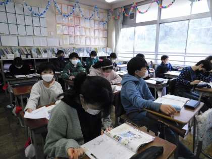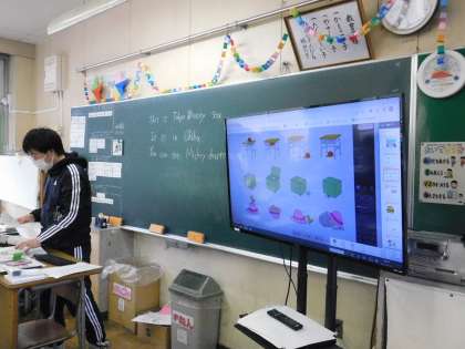 5年2組では外国語の勉強をしていました。日本を紹介する文を考えていました。
