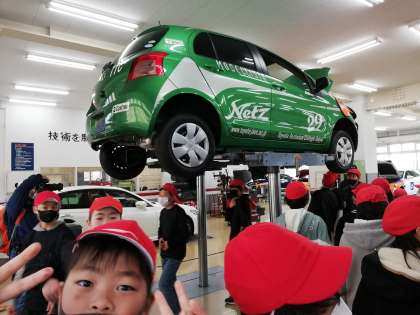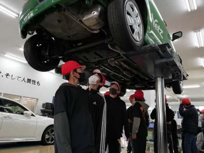 学生さんが整備実習する中、車を上げて車体の下まで見せていただきました!!