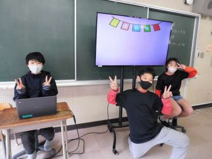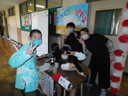 次は視聴覚室でやっている5年2組のお店「スフィロの運動会」です。説明スライドも子どもたちが作りました。