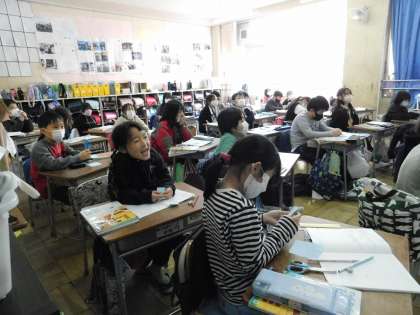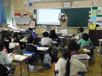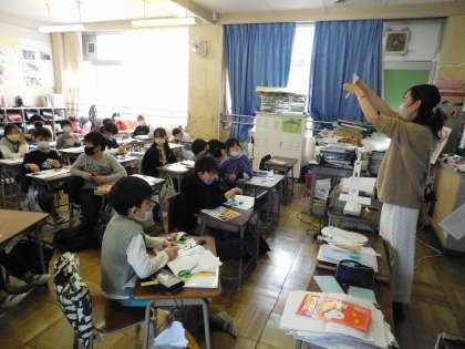 2年1組で職場復帰訓練中の先生が授業をしています。子どもたちの笑顔がいいですね。