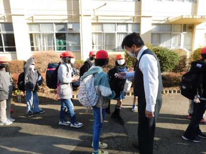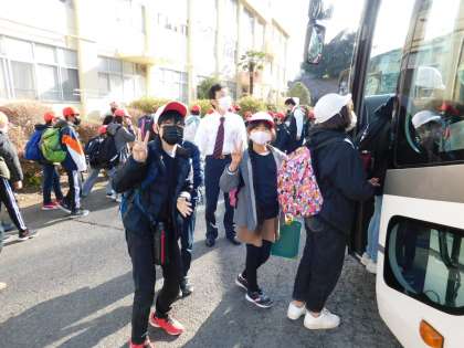 さあ、バスに乗って出発です。まずは手指消毒です。