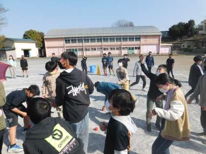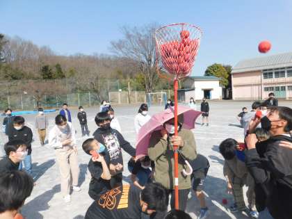 5・6年生合同チームで、赤白に分かれて玉入れをしました。