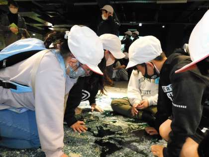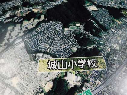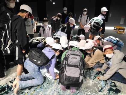 床面には八王子市の地形図があり、各学校の名前が載っていました。子どもたちは城山小とクリーンセンターを探し当て大喜びでした。