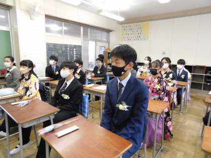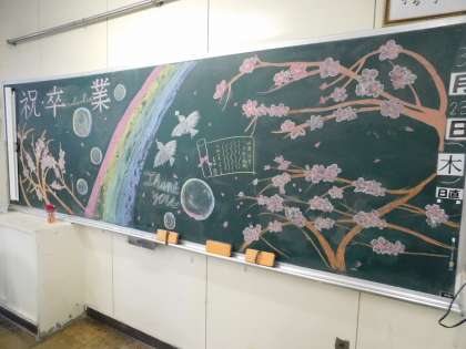 黒板の絵がきれいですね。みんなの門出を祝ってくれています。