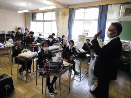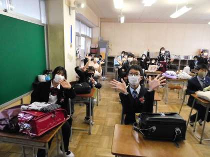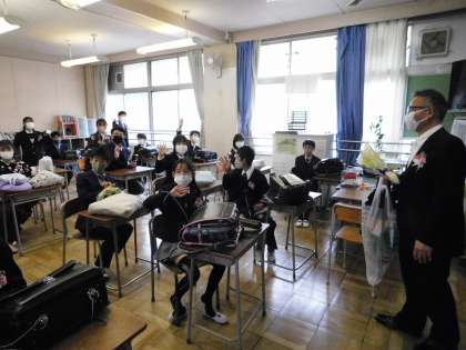 卒業式も終わり、いよいよ門送りの時間です。雨が降っているので、廊下を進みます。その前に、3組を覗いてみました。