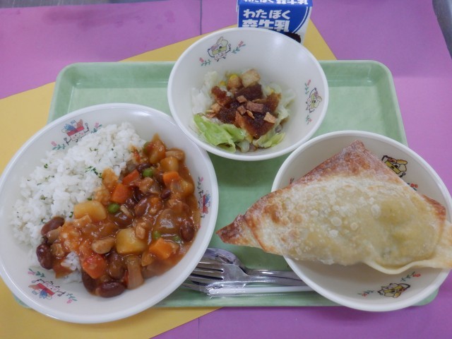 *今日は、ハロウィン献立です。スイートパンプキンパイの中には、八王子産のかぼちゃと、さつまいもが入っています。