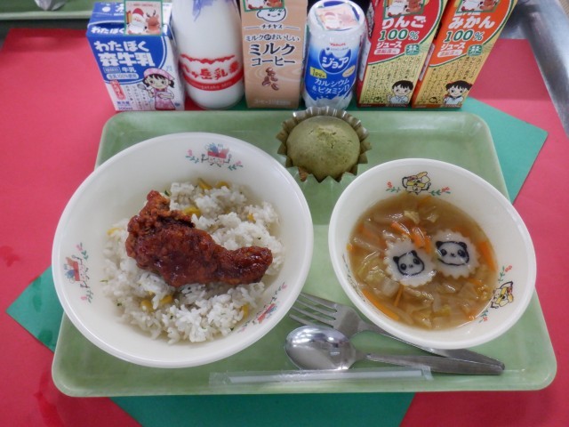 *2学期最後の給食は、クリスマス献立です。各クラスで考えて、みんなの机を丸く円にしたりして、楽しく会食してました。