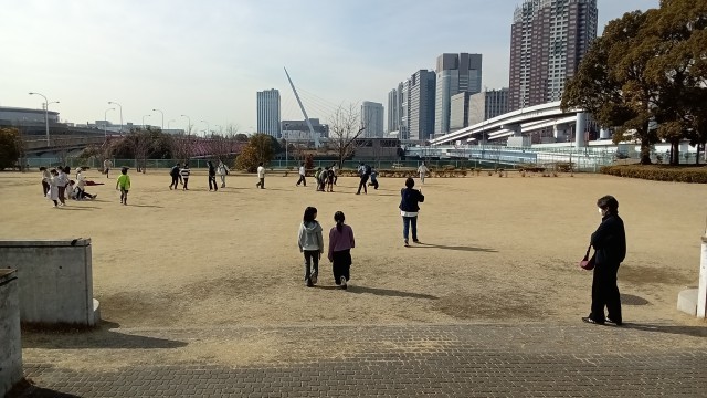 目の前の広場で、クラス写真を撮ります。