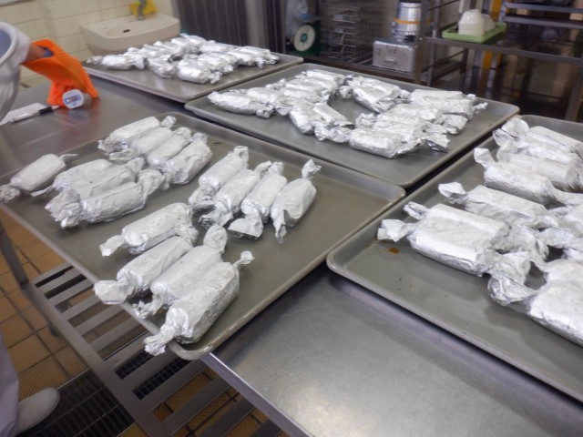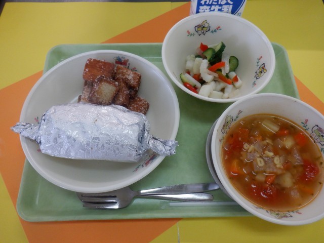 *今日は、5年生のリクエストメニューのピザをアレンジして作りました。パンのみみは切って揚げパンにしました。