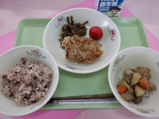 から揚げは、リクエストメニューです。赤飯は、お祝いの時に食べられています。6年生は、もうすぐ卒業ですね。いつも残さず食べてくれてありがとう!