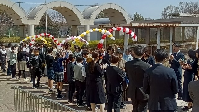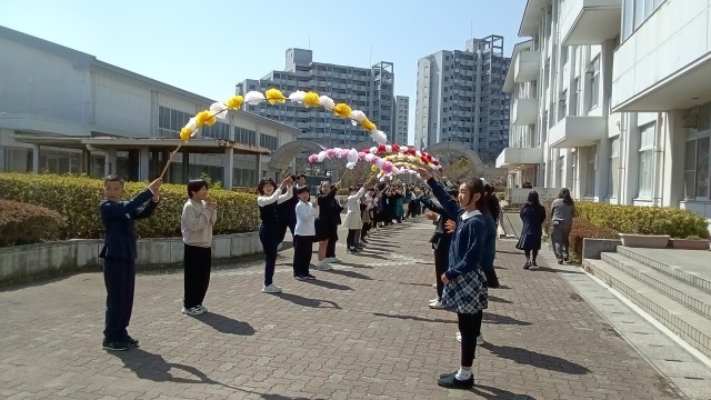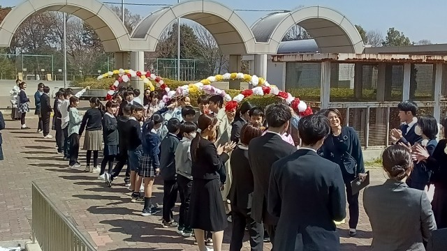 5年生が作る花のアーチをくぐり、卒業生が進みます。
