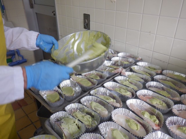 桑都焼きは、桑の葉粉にマヨネーズを加えて鮮やかな緑色にしています。