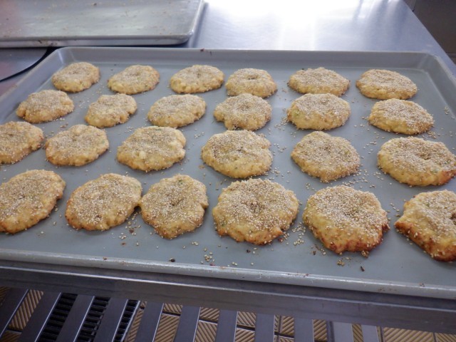 *豆腐と鶏肉で作ったまつかぜ焼きです。。たくさんのごまが表面についています。まつかぜ焼きの裏側には、なにもないことから隠し事をしないといわれています。・・・写真3枚目