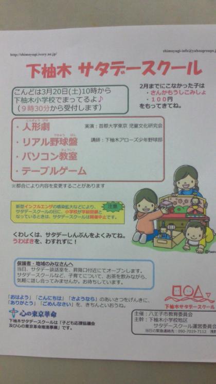 来週土曜日(20日)下柚木サタデースクールがあります。今年度最後です。