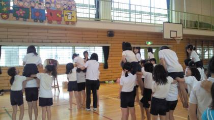 6年生のまねをして、騎馬を組んでみます。「せーの!」掛け声をかけ、力を合わせて立ち上がります