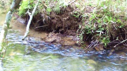 カモは子育て中。11羽の子ガモが川の流れに乗っていました。