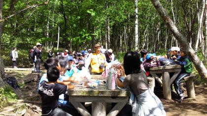 休憩中にもネイチャーガイドの先生から、シカなど戦場ヶ原付近の動物について教えていただきました。本物のシカの角にもさわらせてもらいました。
