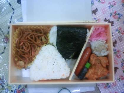 今日のお昼ご飯、おにぎり弁当です。とてもおいしくいただきました。