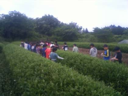 お茶畑に出て、茶摘みをします。みんな興味深そうに摘んでいます。