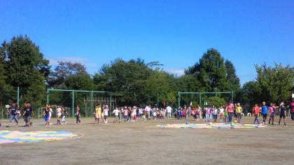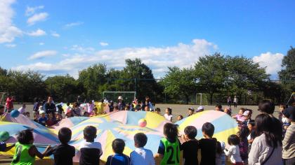 大きな布の上に乗ったボールを、みんなで布をゆらして落とします。