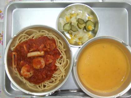 今日は、魚介たっぷりのトマトソースをスパゲティにかけました。