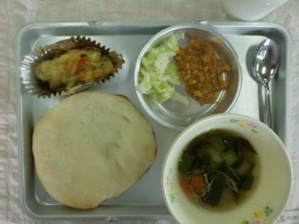 トルティーヤという、とうもろこしで作ったパンに肉や野菜などいろいろな具をはさんで食べる料理です。給食の具は、豚のひき肉、たまねぎ、にんじん、ピーマンを炒め、チリパウダーでピリ辛に仕上げたタコスミートとボイルキャベツです。