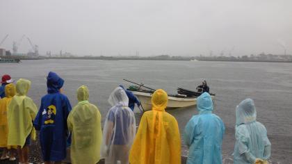 綱が岸に戻ったら、2か所から列になって綱を引きます。全員で力を合わせて…