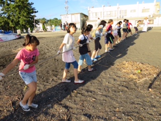 宿舎に着いて開校式をしたあと、息つく暇もなく地引き網体験を行いました。
