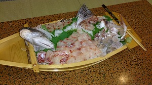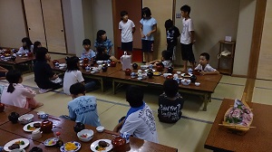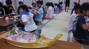 夕食です。地引き網で獲った魚の舟盛りが出ました。食事係の合図で、元気にいただきます!