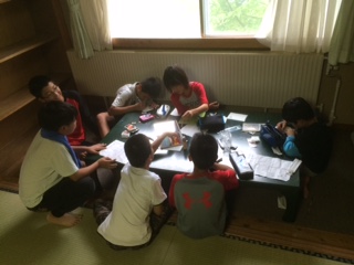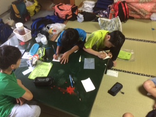 1組の男の子たちも、お風呂から帰ってきてハガキを書いています。