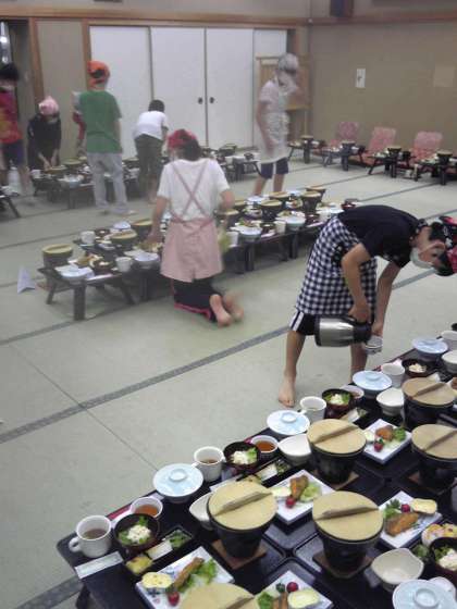 夕食の準備。係の児童がてきぱき働いています。