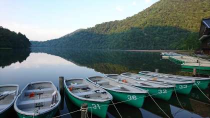 少しひんやりとした空気が漂う湯の湖。遠くからは、鳥のさえずりが聞こえてきます。風はなく、湖畔に間もなく陽がさそうとしています。