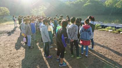 朝日に包まれて、湖畔での朝会です。全員、元気です。