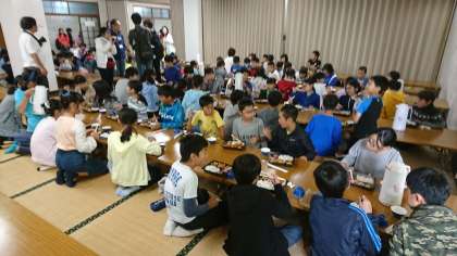 11時30分、宮上小学校との昼食会です。どのテーブルも話が弾んでいます。