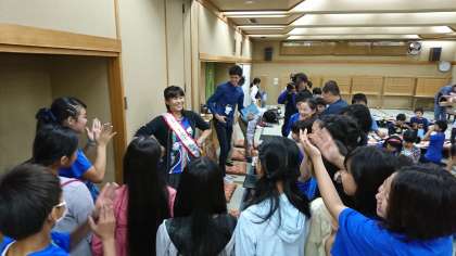 朝食の後にサプライズ。2組の子供たちは、昨晩、久武先生に「誕生日おめでとう」のメッセージを書き、今、プレゼントしました。