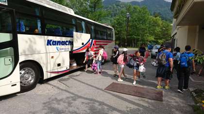 荷物をバスに運び、いよいよ宿を後にします。「お願いします」と言葉を添えて、バスガイドさんに荷物を託します。