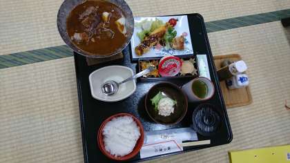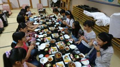 楽しい夕食の始まりです。笑顔で食卓に向かっています。