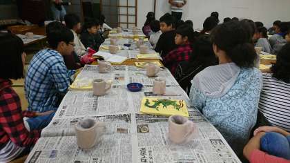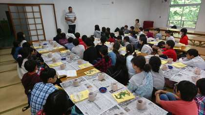 10時20分、二荒レストセンターに着きました。子どもたちの前にあるのは、マグカップ。益子焼きの体験が始まります。