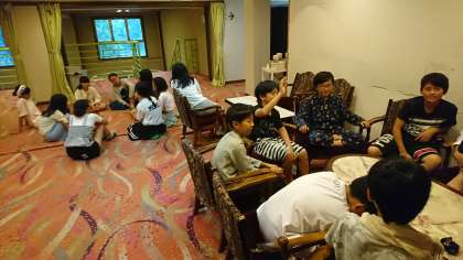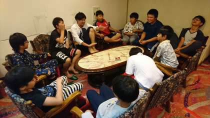 ラウンジで寛いでいます。担任を交えて、推理ゲームに夢中です。