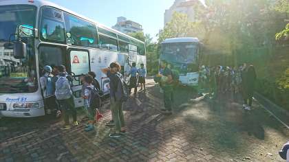 8時4分、子どもたちをのせて、バスは清水へと出発しました。お見送りの方々に元気よく手を振って…。