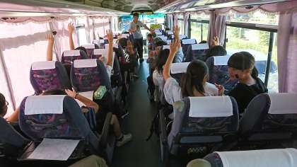 バスレクの次のプログラムは、「清水ビンゴ」です。係から渡された紙に、清水に関する言葉を自分で書ます。次に、レク係が用意した言葉を待ち、ビンゴを目指します。ご覧のように、リーチの子が沢山です。