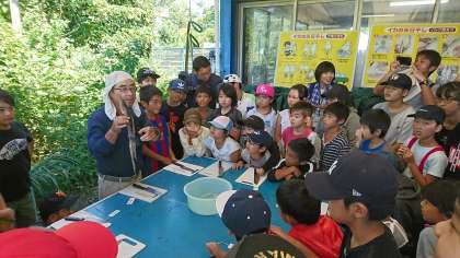 係の方が、イカのさばき方の実演をしています。どの子もしっかり見ています。