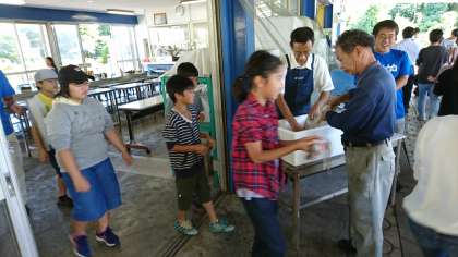 いよいよ体験です。イカを受け取り、調理台へと…。