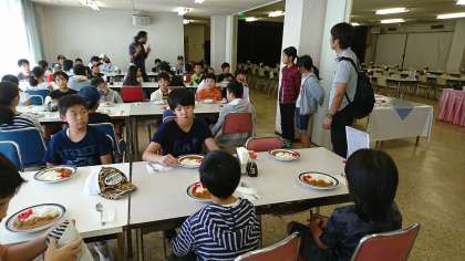 場所を移して、食堂へ。12時5分、「いただきます」。お昼は、カレーライスです。
